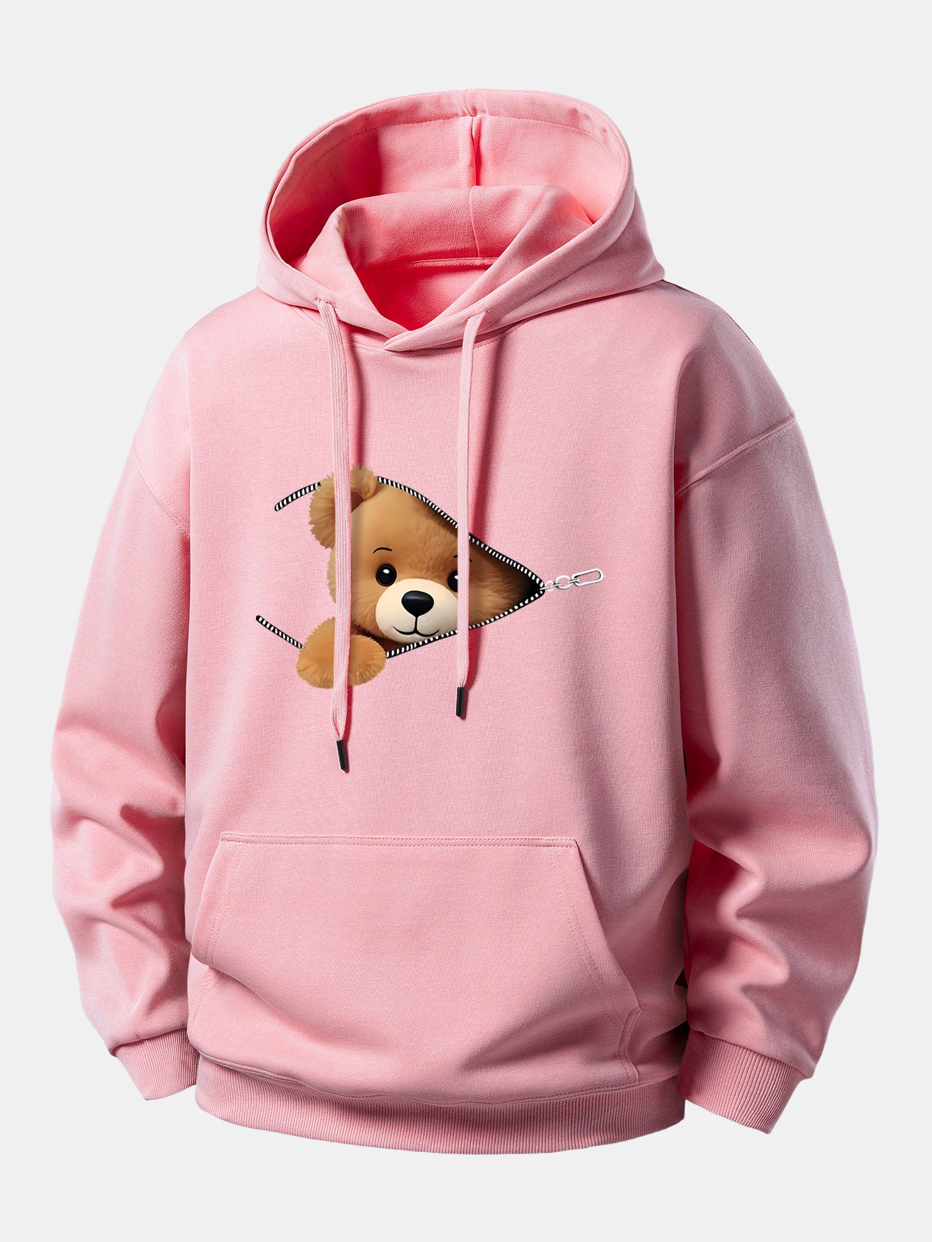 Designed with a cute zipper-holding bear graphic at the center, this hoodie brings a fun and cozy vibe to casual outfits. Made from soft, warm fabric, it provides comfortable wear whether you're lounging, heading out, or layering for cooler weather.