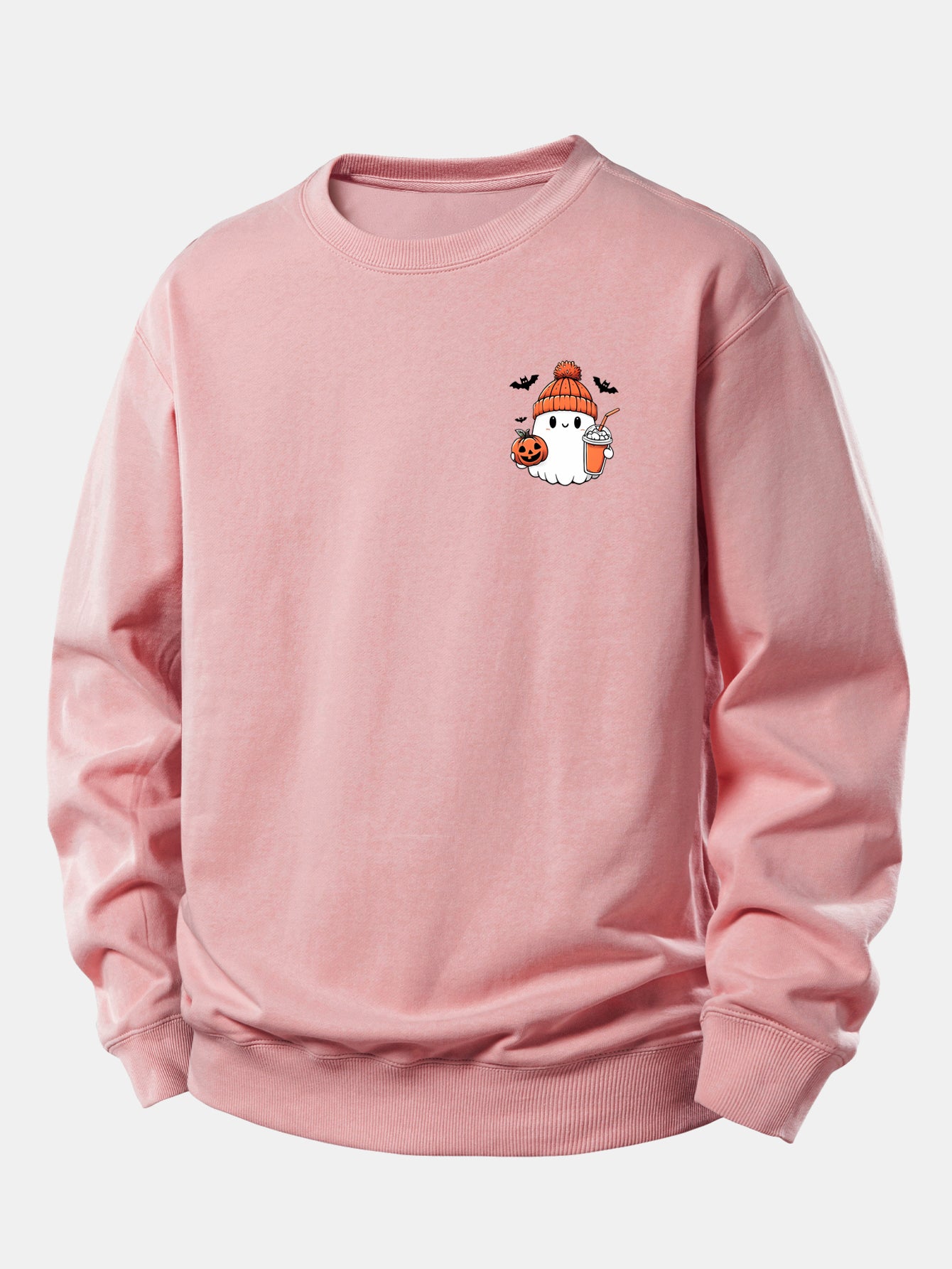 Get cozy and festive with our cute halloween ghost pumpkin print relax fit sweatshirt. Featuring an adorable ghost in a beanie holding a pumpkin spice latte alongside a smiling jack-o'-lantern, this sweatshirt is the perfect mix of spooky and sweet.